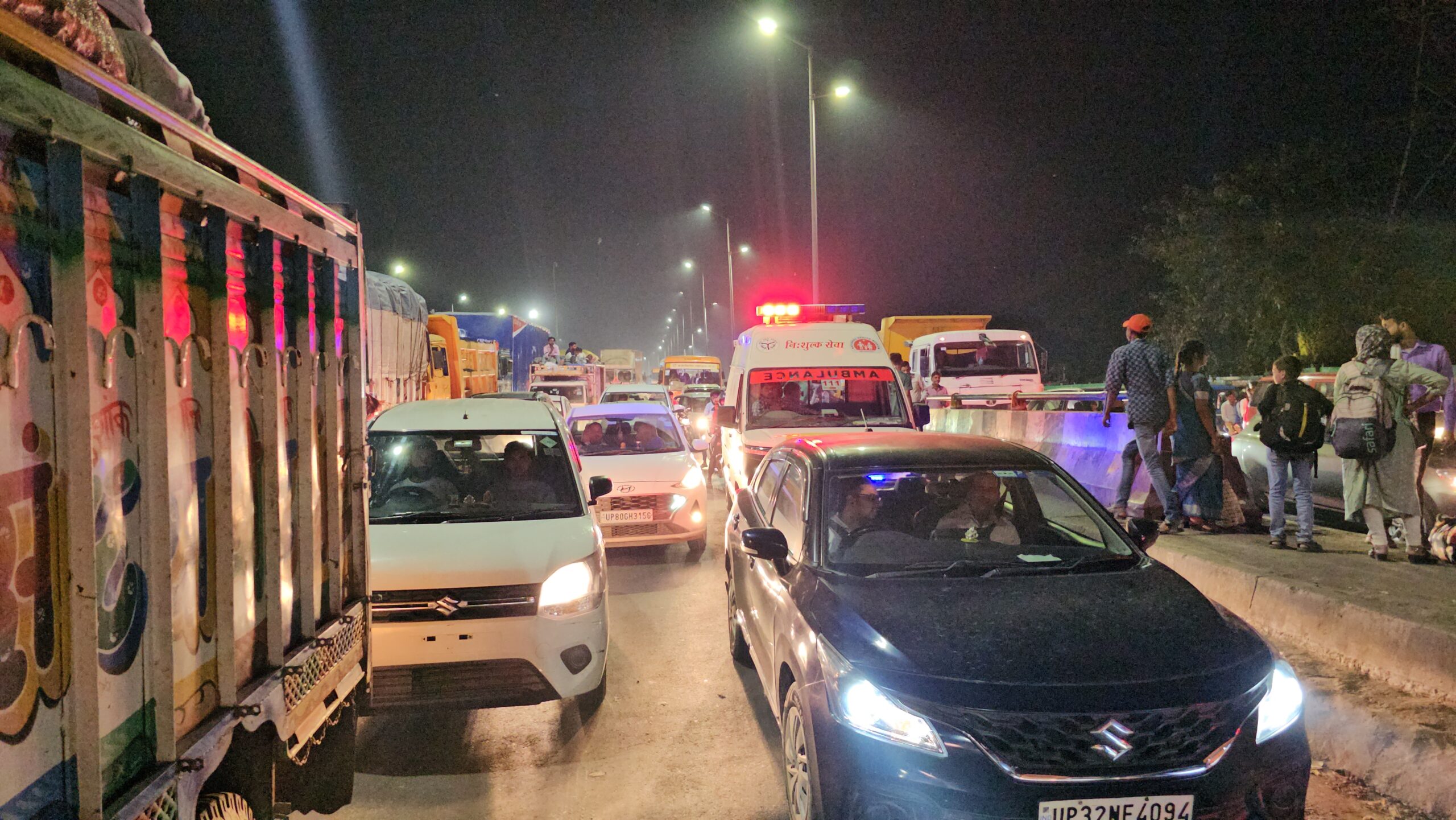 जाम इतना भयंकर था कि एंबुलेंस भी जाम में फस गई एंबुलेंस सायरन देती रही लेकिन जाम आगे भयंकर लगने के कारण उसे भी करीब आधा घंटे तक जाम से जूझना पड़ा ।