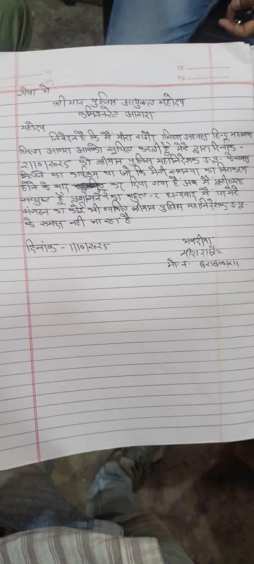 भारत लीक्स, आगरा l ताजगंज क्षेत्र की रहने वाली मीरा राठौर (जिला अध्यक्ष हिंदू महासभा )जो लगातार प्रशासन से कार्रवाई हेतु मांग कर रही थी , और बुधवार को उन्होंने घोषणा की थी l कि वह लखनऊ जाकर डीजीपी महोदय के सामने पेश होकर कार्रवाई की मांग करेंगे l लेकिन इसके बाद अभी हाल ही मीरा राठौर का हाल ही में बयान आया है कि वह पुलिस की कार्रवाई से संतुष्ट हैं और आगे जाकर वह किसी प्रकार की कोई कार्यवाही नही चाहती । अतः उनकी समस्या का समाधान हो गया है l साथ इन्होंने थाना एत्मादोला पुलिस का भी धन्यवाद किया है l